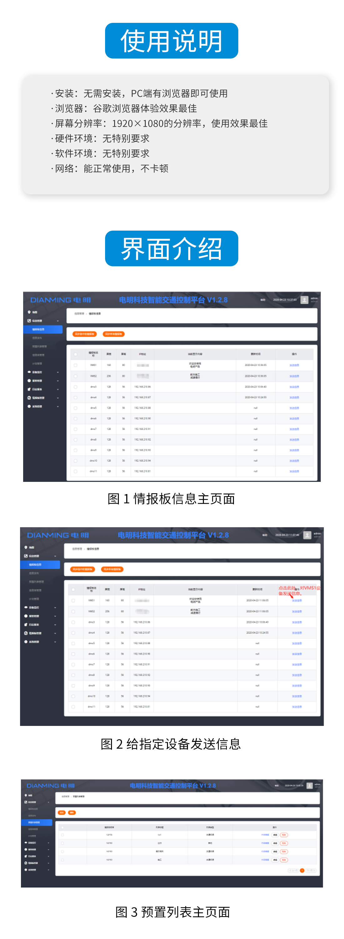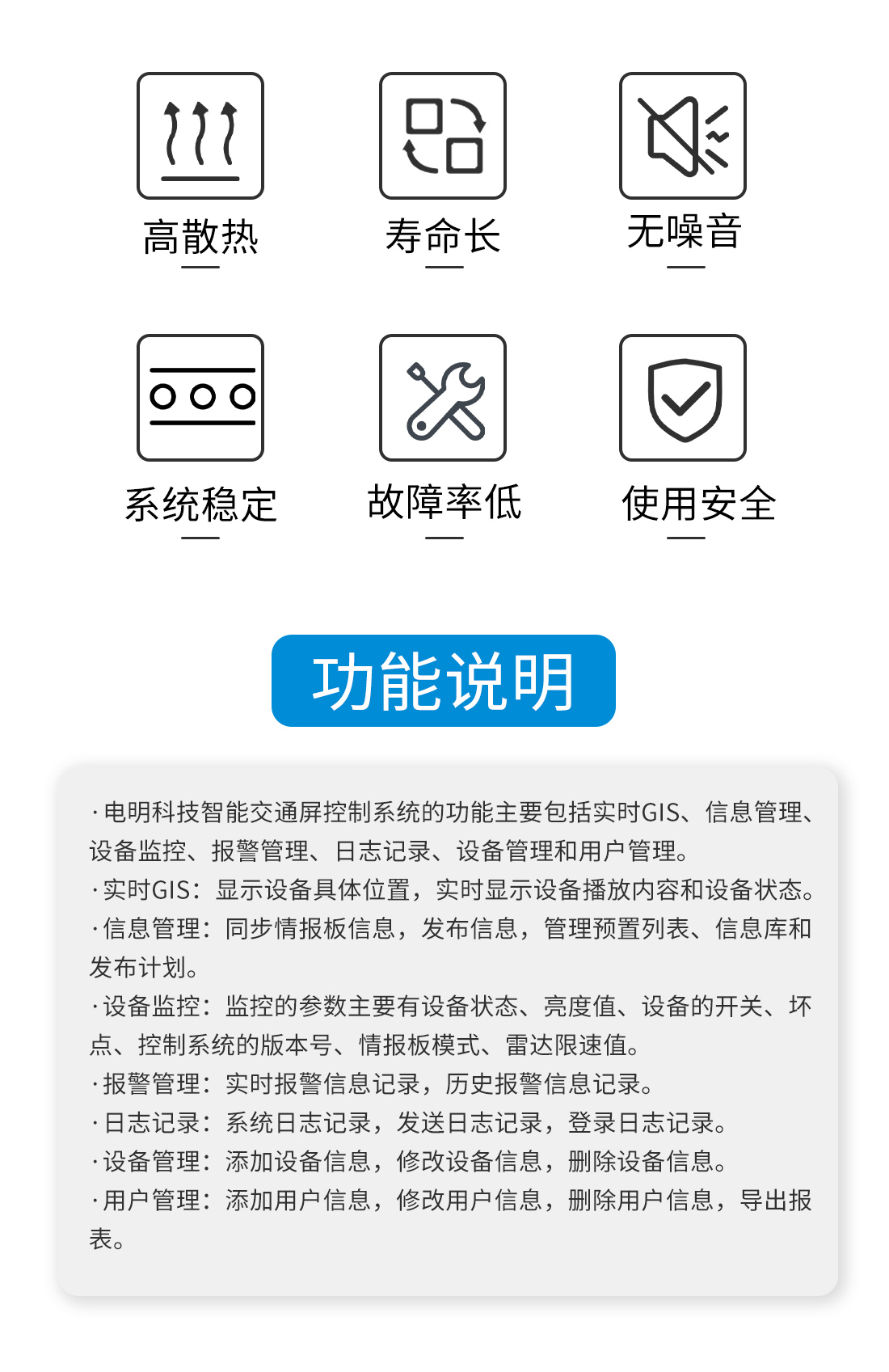 BS交通屏控制系統,使用BS交通屏之前,在對城市功能布局、路網結構、交通管理科技基礎和道路交通狀況等系統研究與分析的基礎上,建立以行車指引為主的交通屏系統。功能主要包括實時GIS、信息管理、設備監控、報警管理、日志記錄、設備管理和用戶管理。