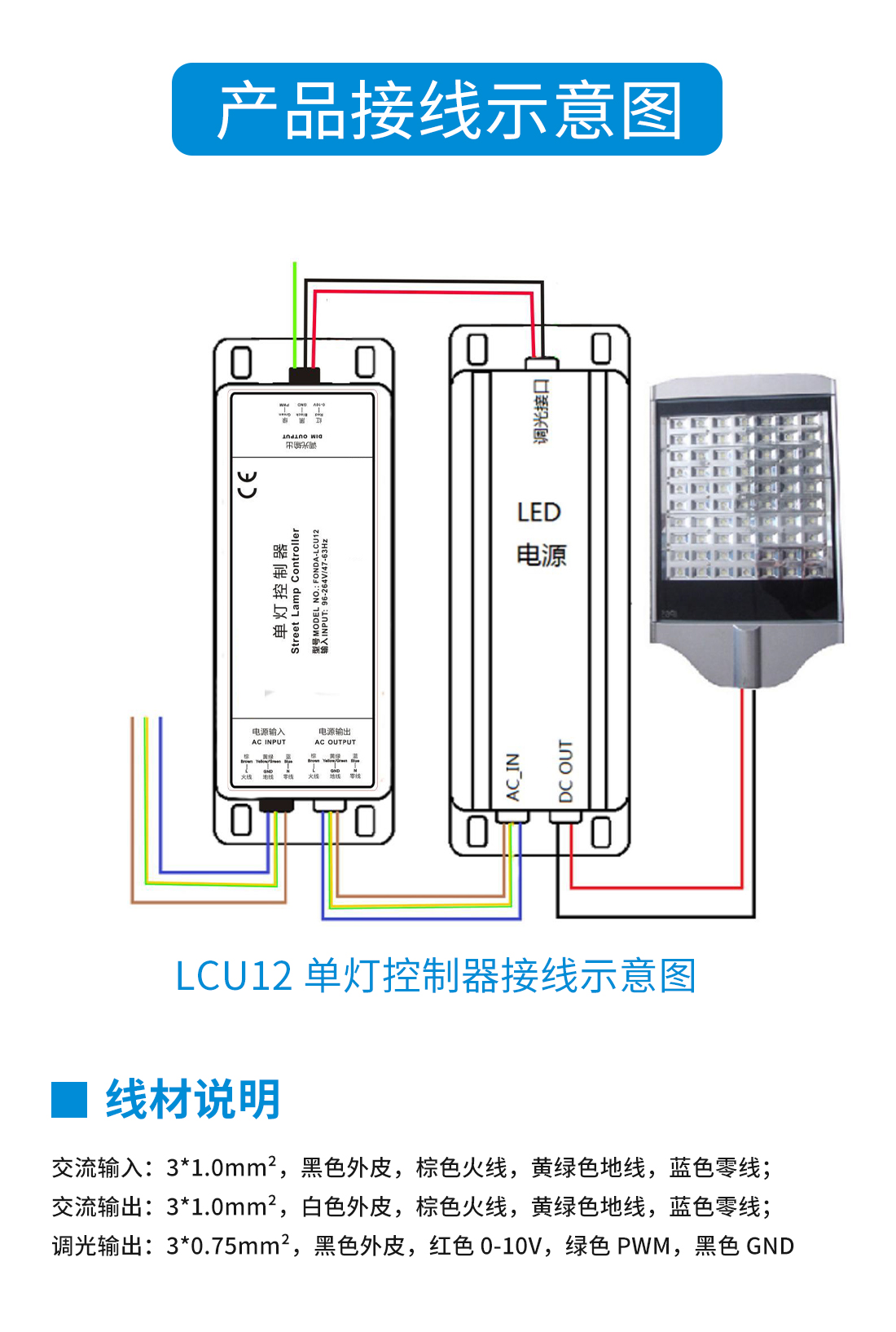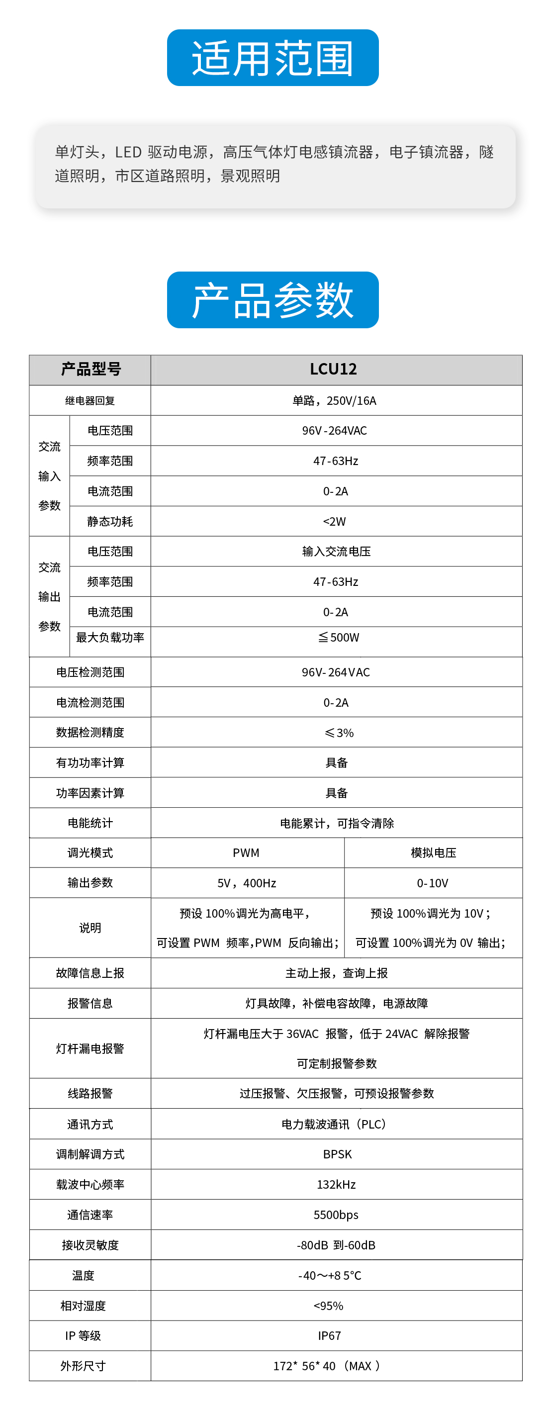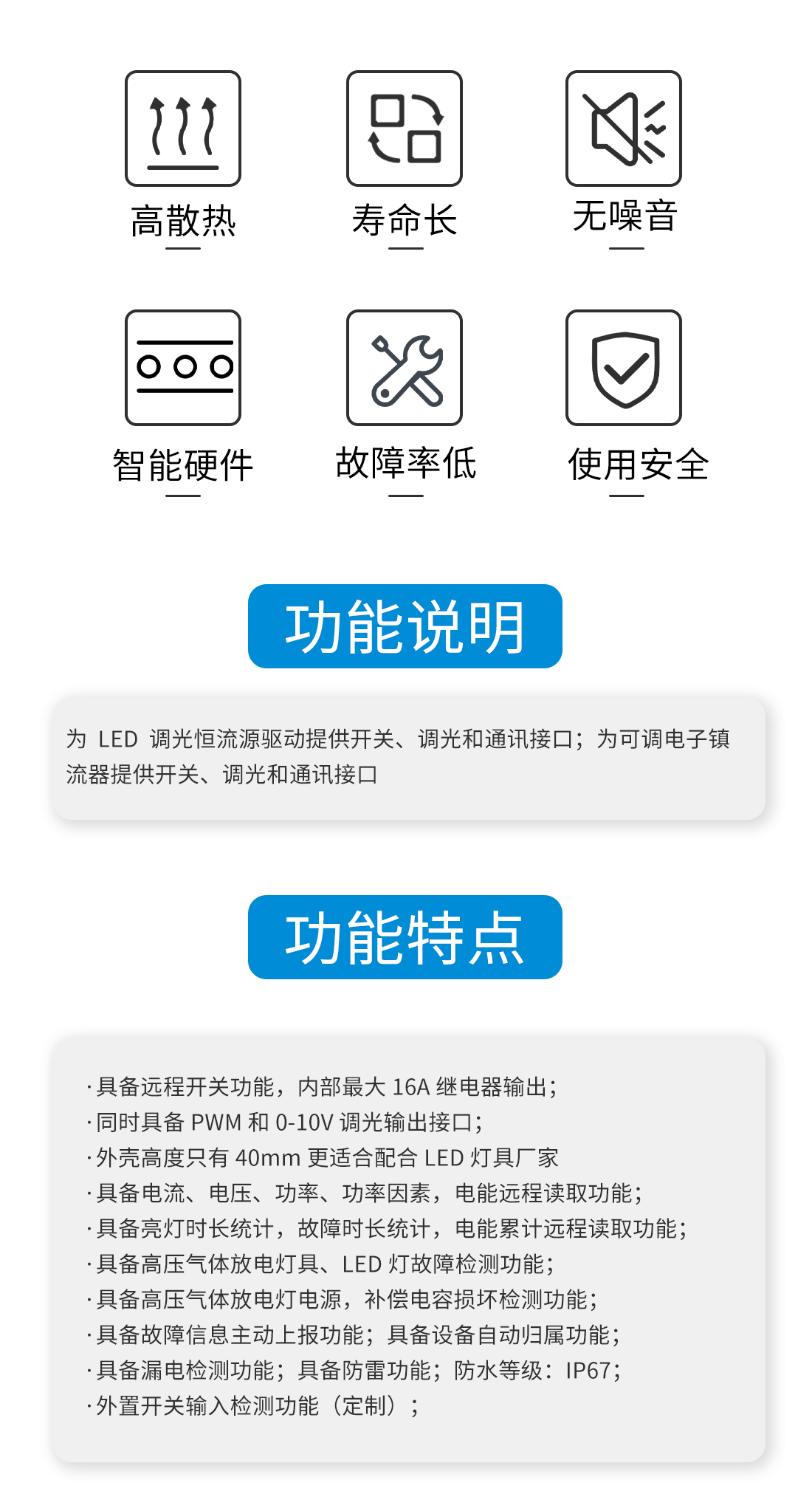 具備遠程開關功能,內部最大16A繼電器輸出;同時具備PWM和0-10V調光輸出接口;具備電流、電壓、功率、功率因素、亮燈時長統計,故障時長統計,電能累計遠程讀取功能;具備設備自動歸屬、故障信息主動上報功能;具備防雷、漏電檢測功能;防水等級:IP67。