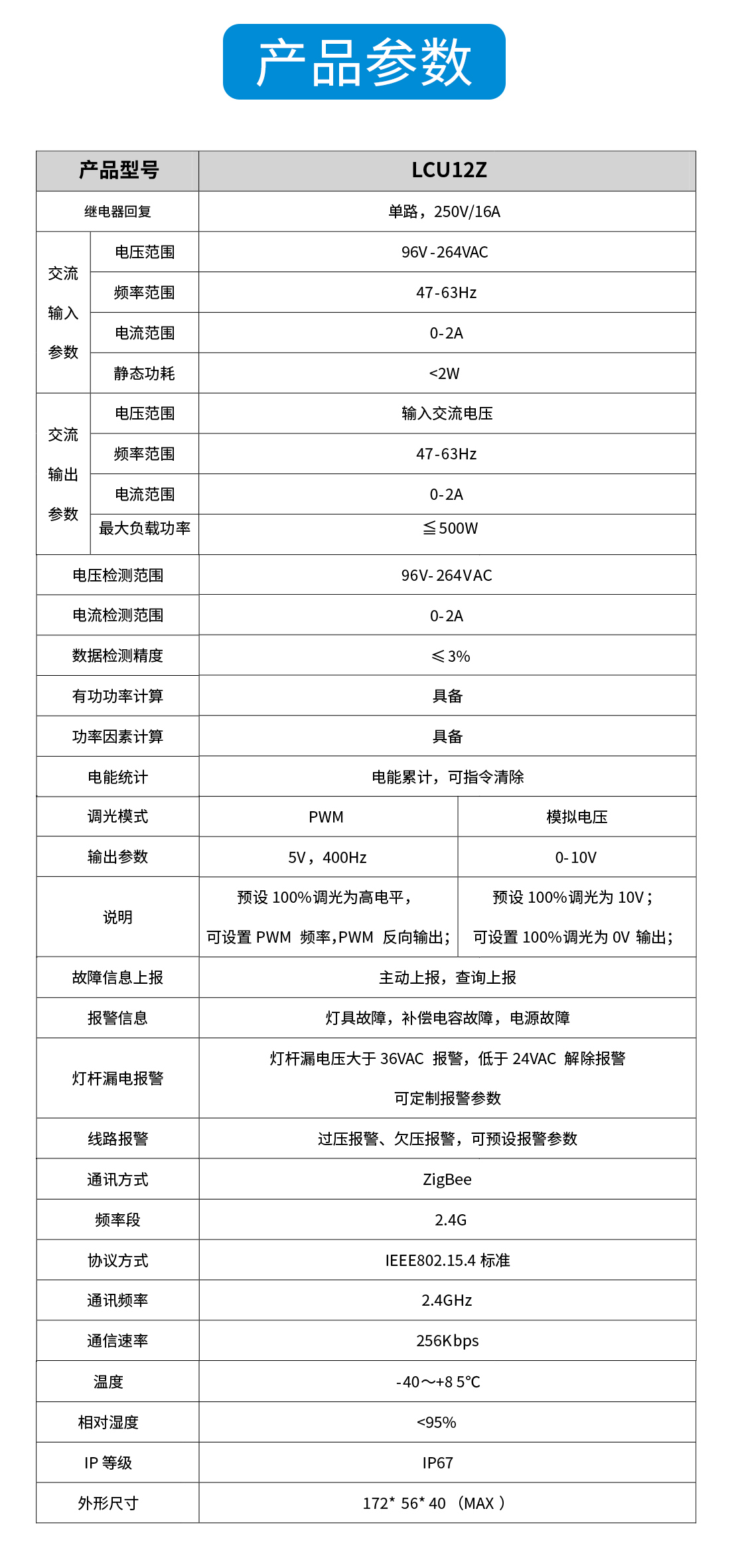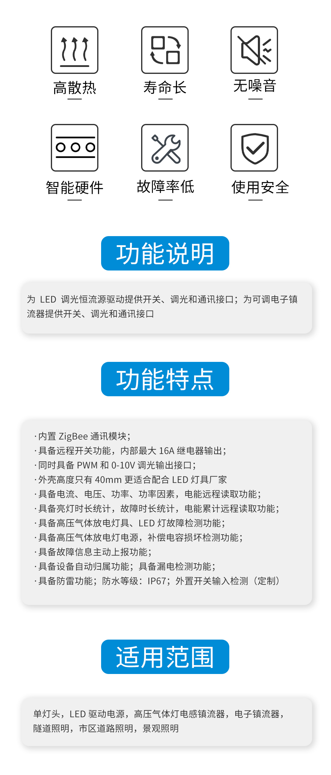 為LED調光恒流源驅動提供開關、調光和通訊接口;為可調電子鎮流器提供開關、調光和通訊接口;內置ZigBee通訊模塊;具備遠程開關功能,具備PWM和0-10V調光輸出接口;具備設備自動歸屬、故障信息主動上報功能;具備防雷、漏電檢測功能;適用于隧道照明,市區道路照明,景觀照明等場景。