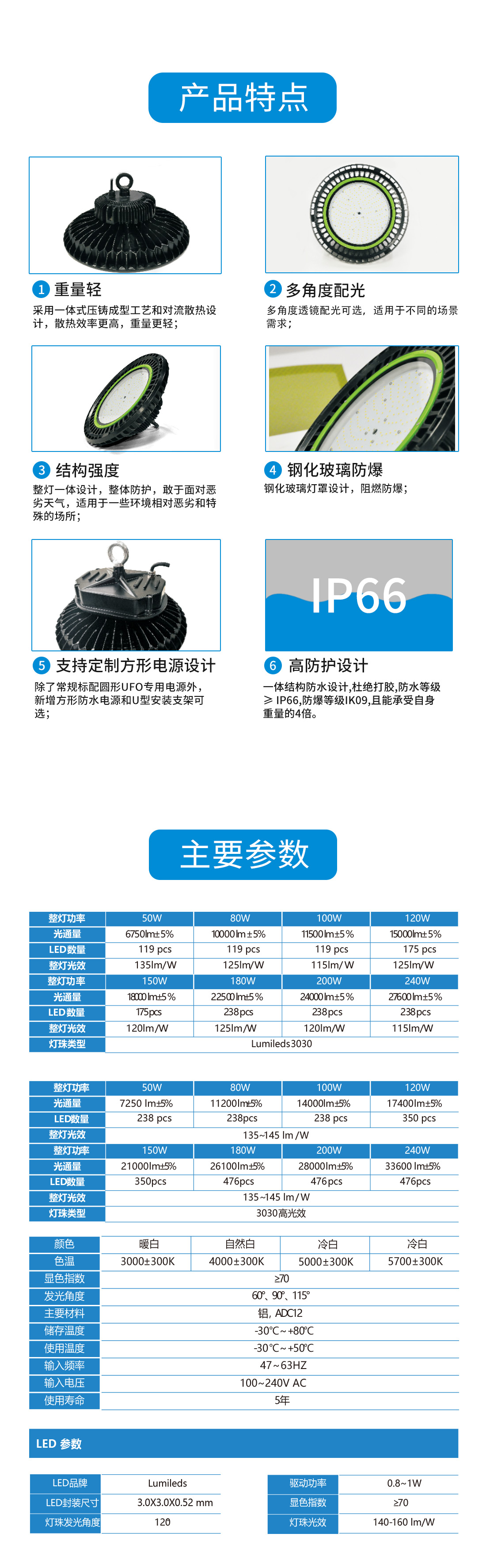 適用于一些環(huán)境相對惡劣和特殊的場所。整燈采用壓鑄成型,鋼化玻璃燈罩阻燃防爆,整燈IP65設計。同時更有多種角度的二次光學透鏡可選。滿足一些特殊配光需求。除了常規(guī)標配圓形UFO專用電源外,新增方形防水電源和U型安裝支架可供選擇。