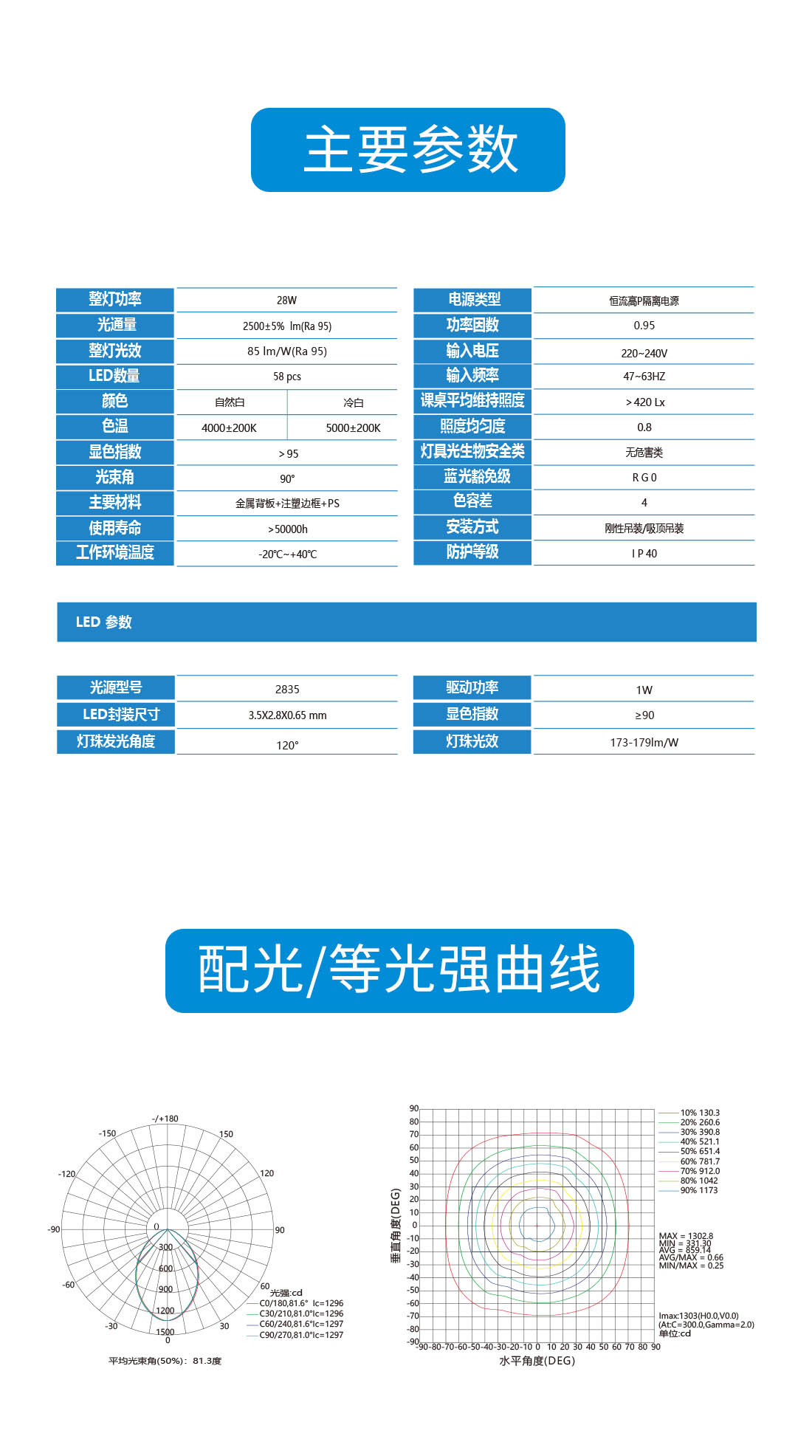擴散板采用優質PS材料,霧度75%,亮度較高,亮度均勻度高,不刺眼不眩目,課桌平均維持照度>420lx;照度均勻度0.8;