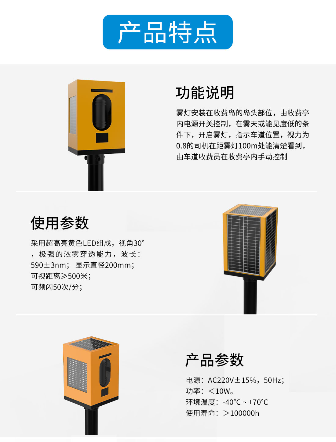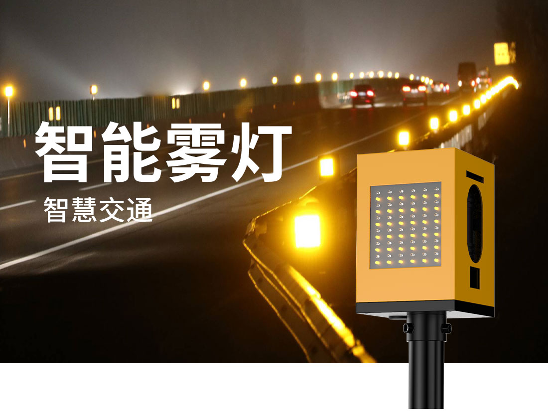 智慧霧燈安裝在每一車道的島頭部分,在霧天、黑夜或能見度低的條件下,霧燈開啟指示車道位置。霧燈應是高亮度的,以保證在霧天、黑夜或能見度低的條件下,眼睛視力0.8以上的司機在75米外可以清晰看見。