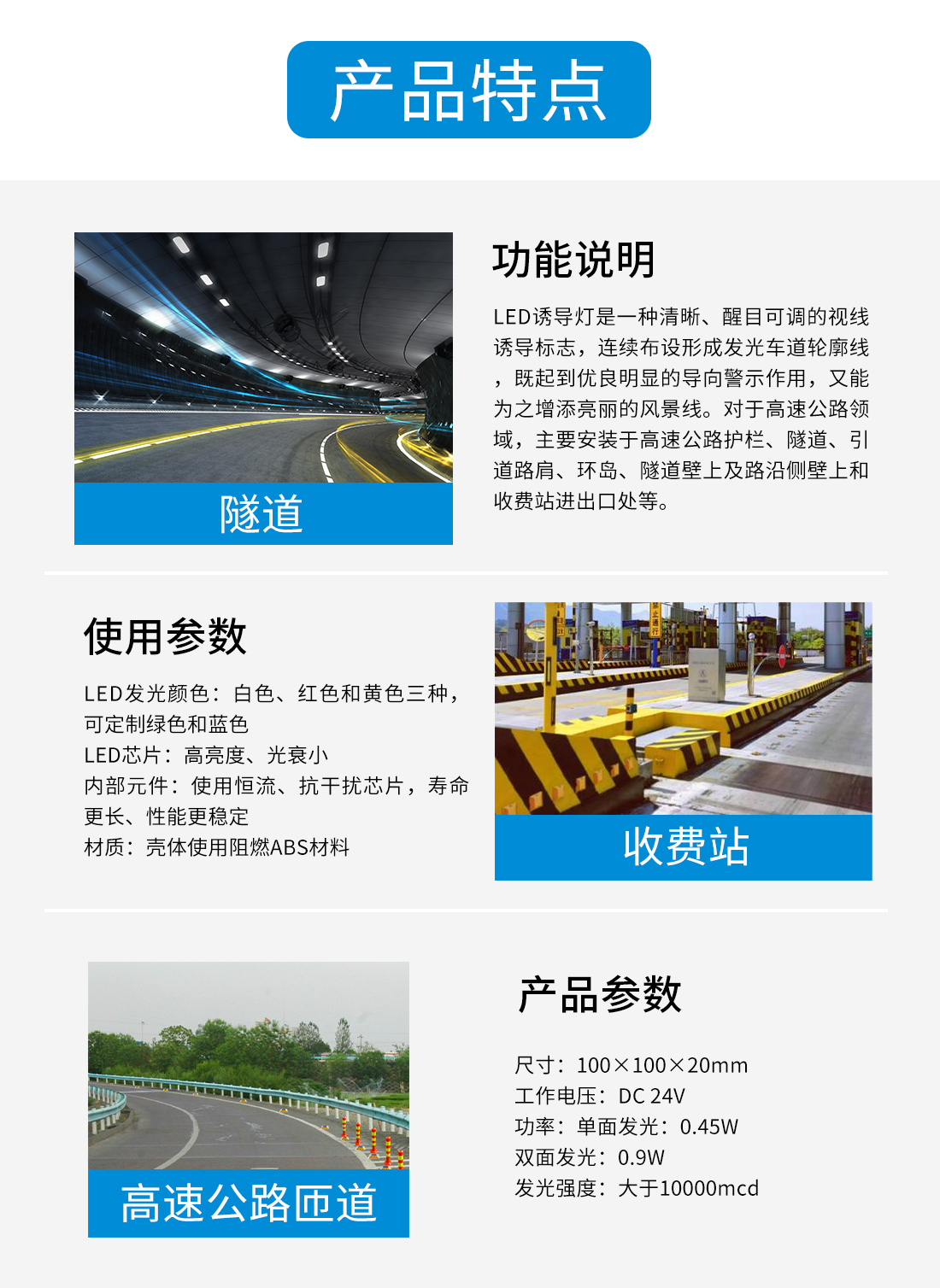 LED誘導燈,是一種清晰、醒目可調的視線誘導標志,連續布設形成發光車道輪廓線,既起到優良明顯的導向警示作用,又能為之增添亮麗的風景線。主要安裝于高速公路護欄、隧道、或隧道壁上及路沿側壁上。