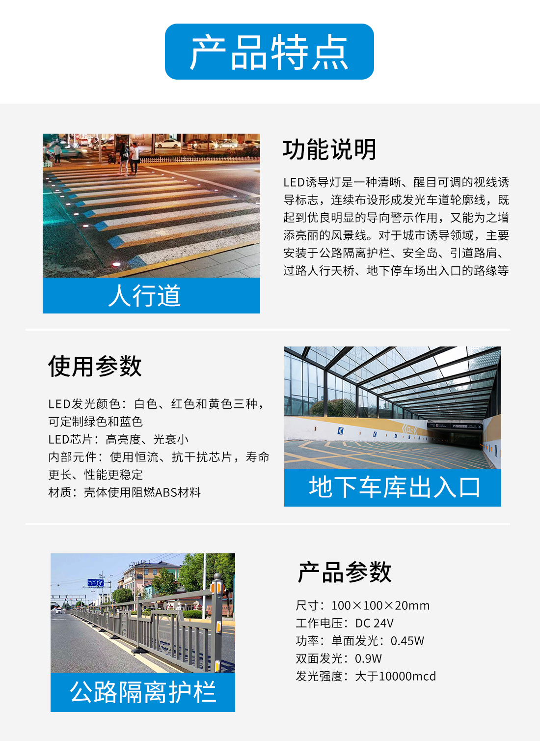 LED道釘,是一種清晰、醒目可調(diào)的視線誘導(dǎo)標(biāo)志,連續(xù)布設(shè)形成發(fā)光車道輪廓線,既起到優(yōu)良明顯的導(dǎo)向警示作用,又能為之增添亮麗的風(fēng)景線。主要安裝于引道路肩、人行道、減速帶、環(huán)島、安全島、地下停車場(chǎng)出入口的路緣或路沿側(cè)壁上。
