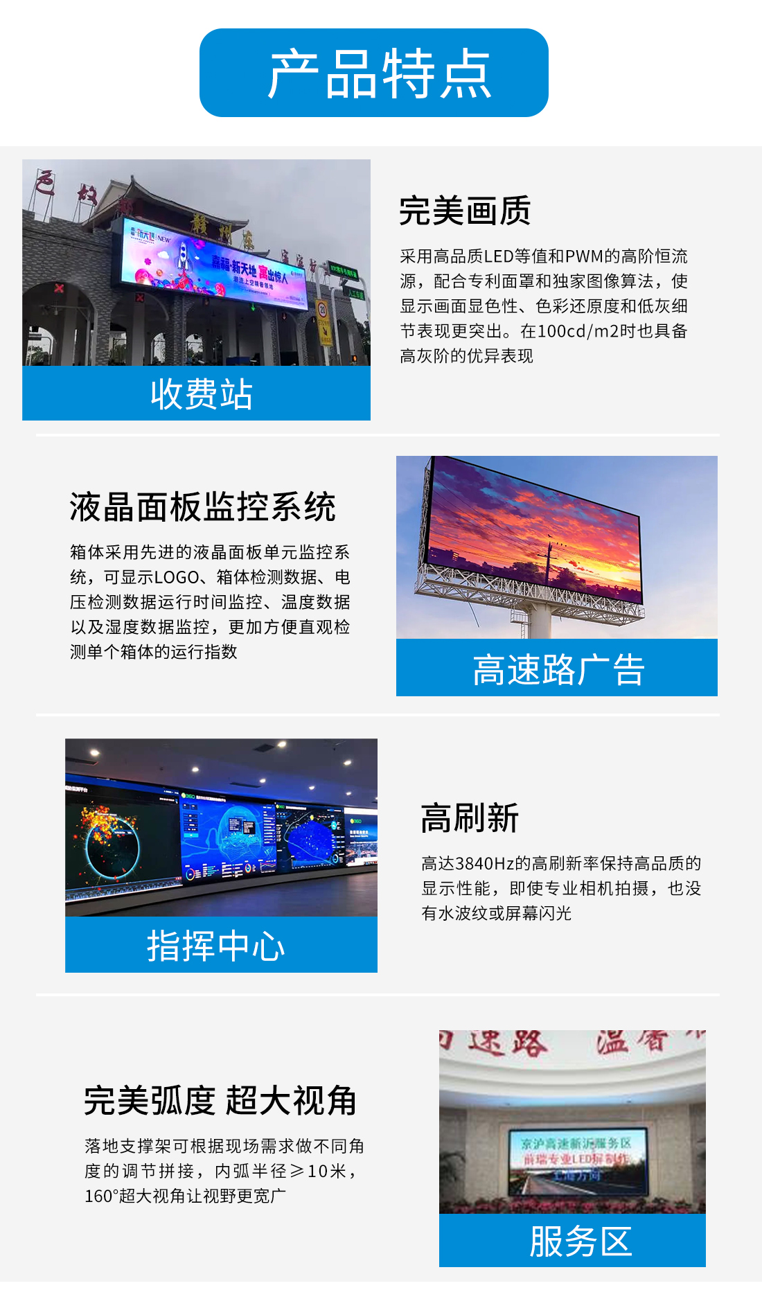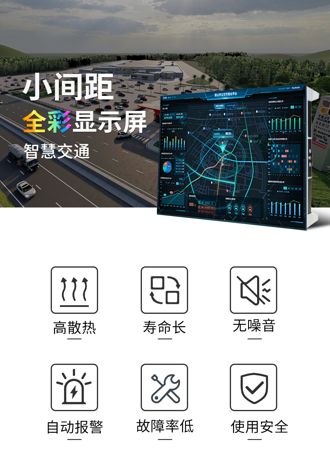 小間距全彩顯示屏,全黑一體化燈珠高對比度,顯示色彩更加靚麗。CNC加工,保證顯示單元之間的無縫拼接。使用含有PWM功能芯片,低亮度不用損失 灰度,并通過控制系統的特殊算法,低灰也能保持完美的色溫和亮度均勻性。主要應用在高速公路收費站、服務區、交通監控指揮中心及路邊廣告屏等場景。