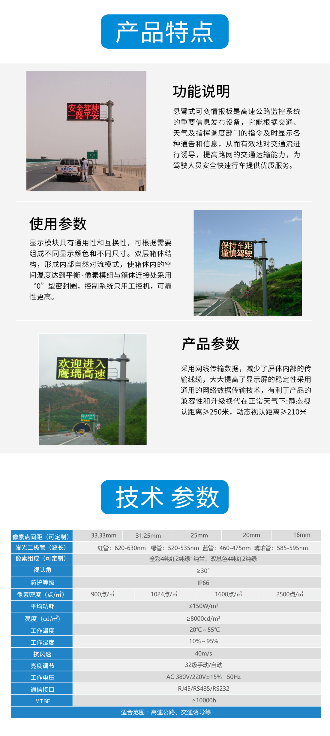 懸臂式可變信息標(biāo)志,是高速公路監(jiān)控系統(tǒng)的重要信息發(fā)布設(shè)備,它能根據(jù)交通、天氣及指揮調(diào)度部門的指令及時(shí)顯示各種通告和信息,從而有效地對(duì)交通流進(jìn)行誘導(dǎo),提高路網(wǎng)的交通運(yùn)輸能力,為駕駛?cè)藛T安全快速行車提供優(yōu)質(zhì)服務(wù)。