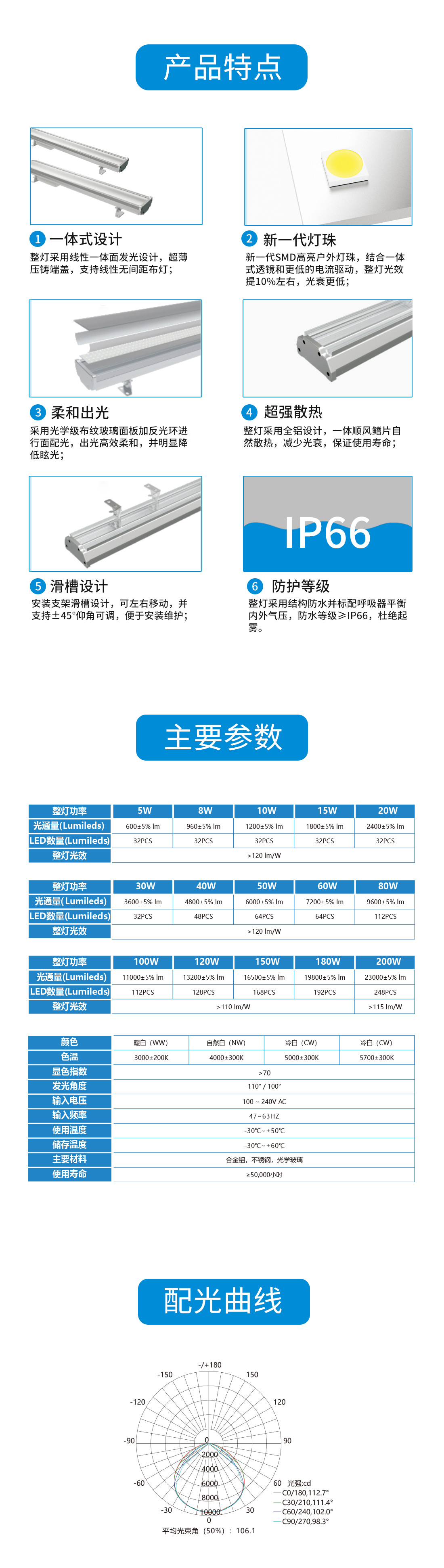一體面發光設計,支持線性無間距布燈;采用光學級布紋玻璃面板加反光環進行配光,出光柔和;整燈采用全鋁設計,一體順風鰭片散熱;安裝支架滑槽設計,可左右自由移動并仰角可調;防水等級IP65。