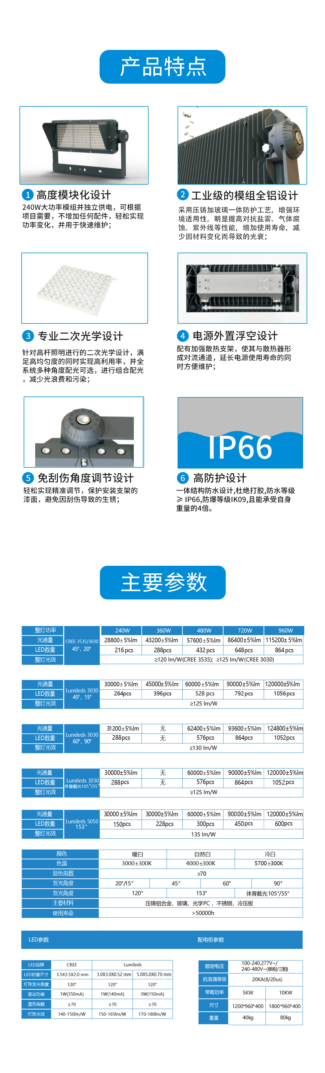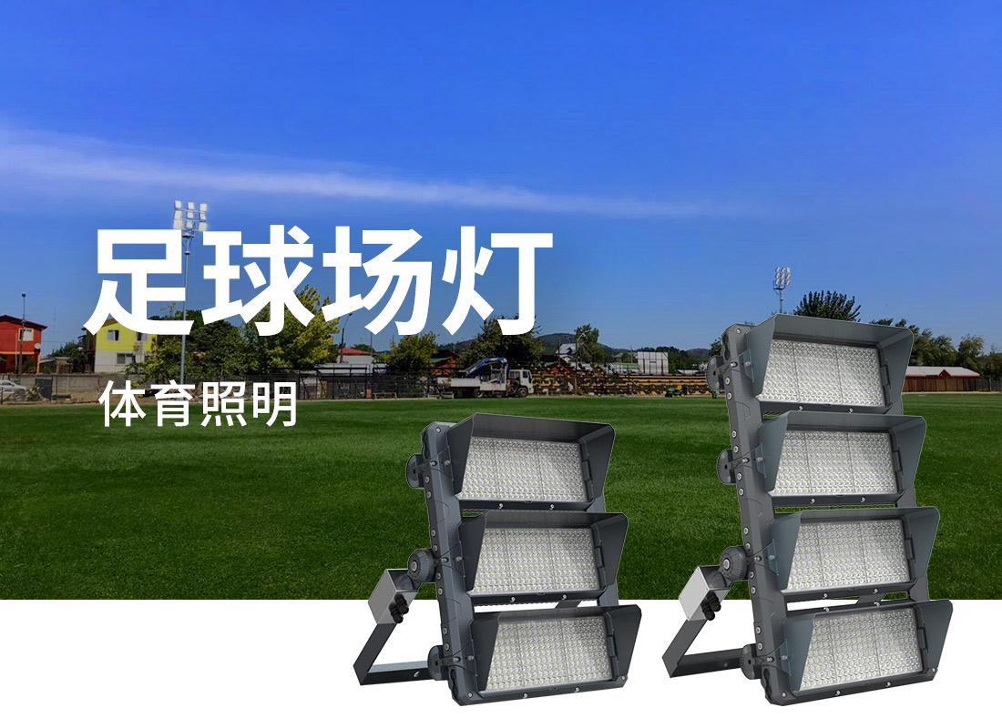 足球場LED照明燈具,多模組可選,多種安裝方式,定制化解決方案,可達比賽級,整燈防護等級≥IP66, 防爆等級IK09,獨立電源腔高效散熱。