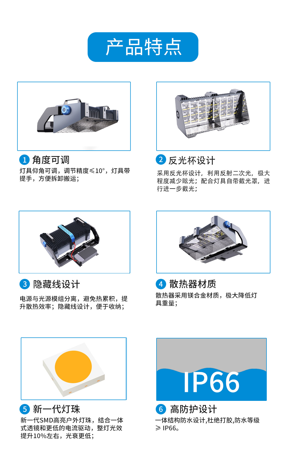 戶外網球場專用照明燈具,定制化解決方案,專業配光,獨立模組設計,角度可靈活調節,防水等級IP66,防爆等級IK09,內置呼吸器。