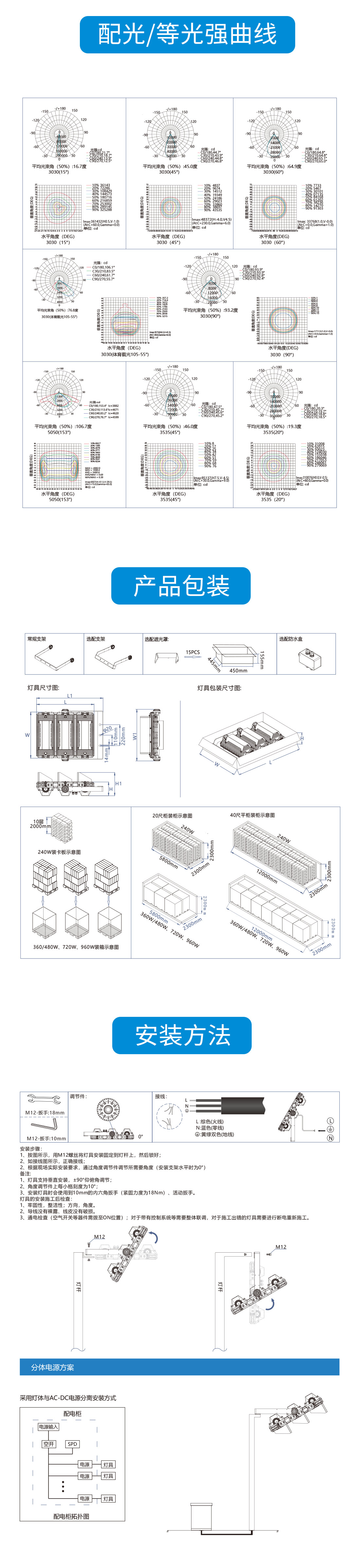 針對高桿照明進行的二次光學設計,滿足高均勻度的同時實現高利用率,并全系統多種角度配光可選,進行組合配光,減少光浪費和污染;